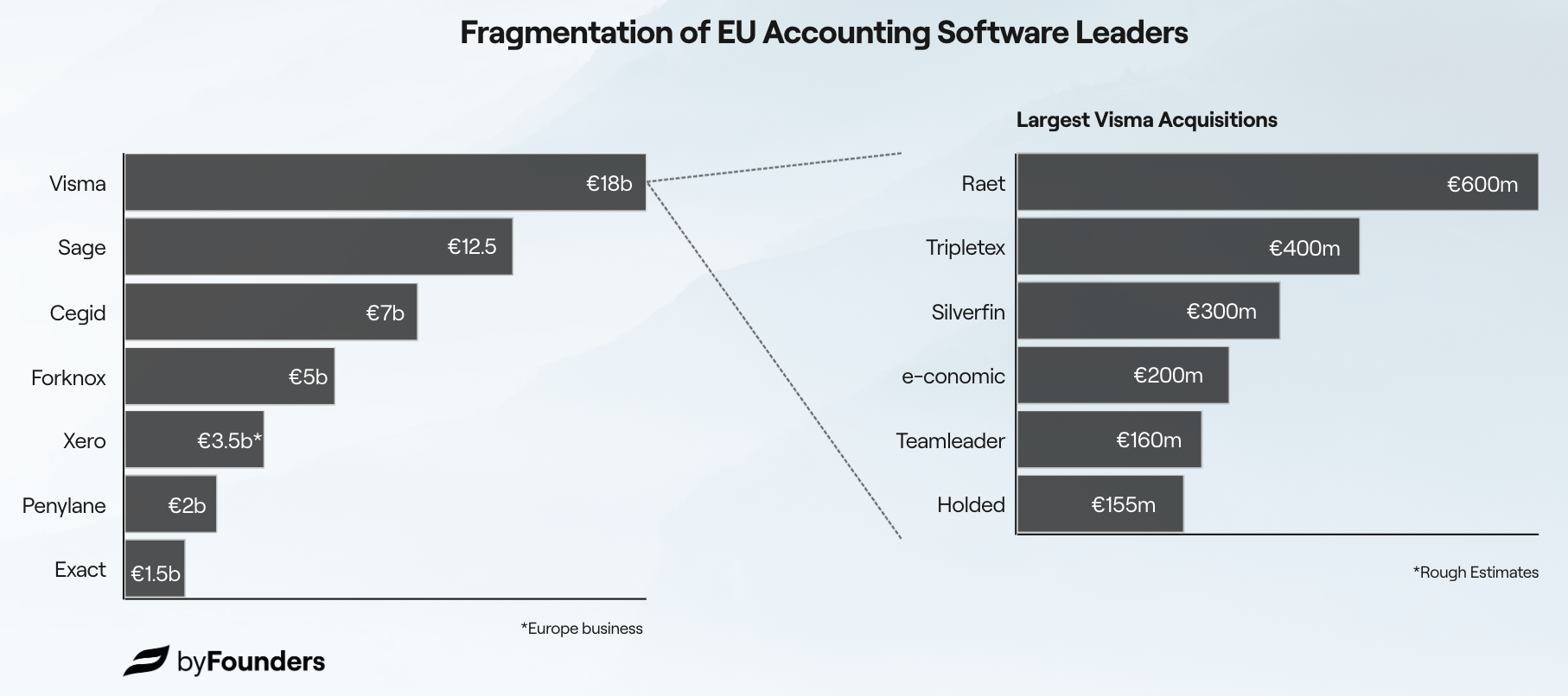 Despite the size of the opportunity, the market remains fragmented. Visma is valued at €19–22 billion and built through more than 190 acquisitions, one of its largest products, Denmark’s e-conomic, serves only ~180–200,000 SMBs. The rest of its portfolio consists of small, country-specific brands. Sage presents a similar story. With a $14 billion market cap and ~38 acquisitions, it appears a global leader but is in reality a portfolio of regional products. Across the continent the pattern repeats. Cegid in France and Iberia (€6.8B after merging with Grupo Primavera) remains a patchwork of local solutions. Fortnox dominates Sweden but, despite a ~$5.5 billion take-private bid, generates only ~$200 million in annual revenue. Exact, acquired by KKR for €1.5 billion, serves ~400,000 SMBs but is largely confined to the Benelux region. Germany’s DATEV, structured as a cooperative, counts over 800,000 customers yet operates almost exclusively at home.